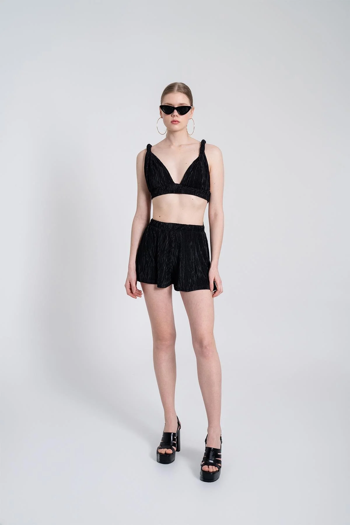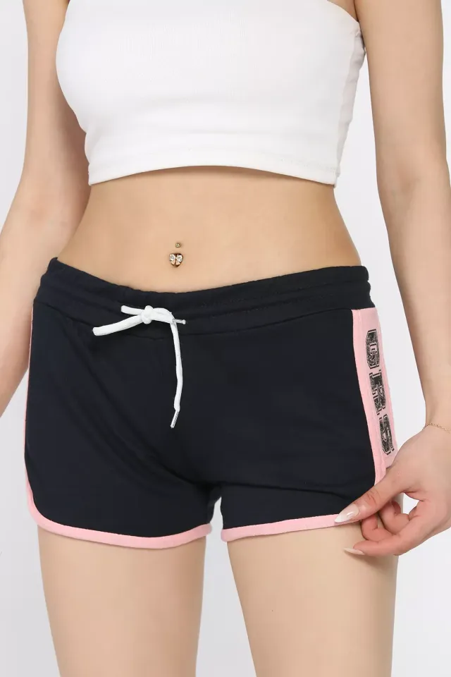 شورت بلونين بطبعة كتابة على الأمام مع خصر مطاطي. خيار شبابي ومريح للنساء.