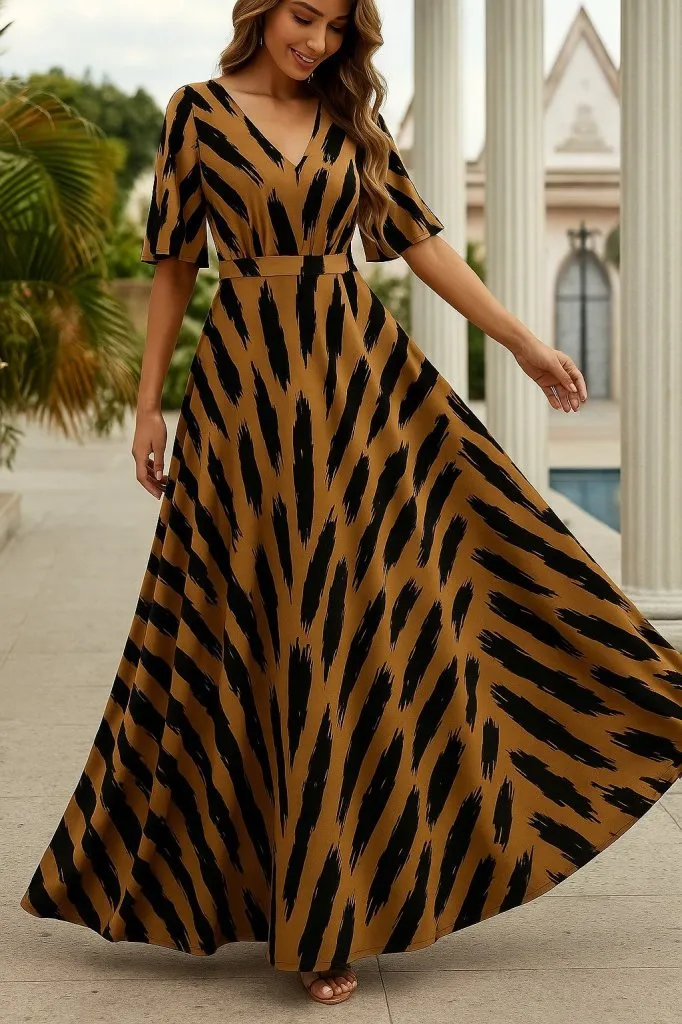 فستان نسائي ميدي مزهر بياقة V وأكمام قصيرة، بقصة كلوش واسعة وانسيابية مثالية لأيام الصيف المريحة.