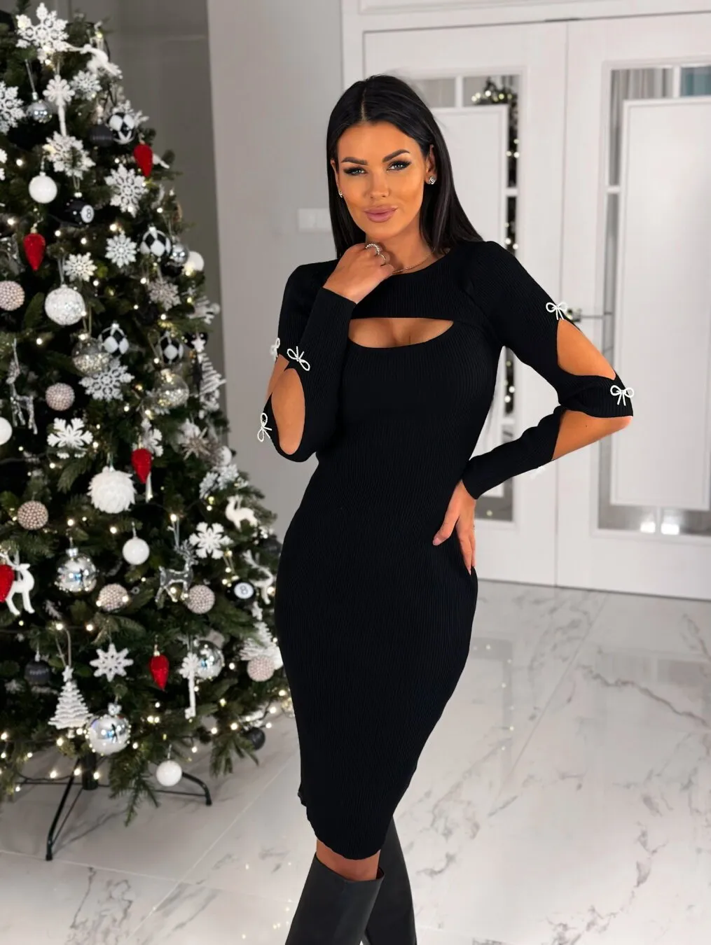 فستان نسائي قصير بكتف واحد وتفصيلة فيونكة مصنوع من كريب لامع، تصميم أنيق بقصة ضيقة ولمسة غير متماثلة أنثوية.