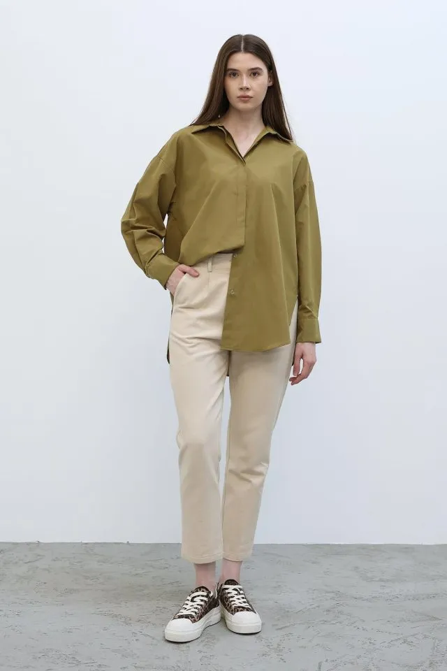 قميص نسائي بلون سادة، بأكتاف منسدلة وتفاصيل مخرمة. قصة مريحة وتصميم أنيق، مثالي للإطلالات الكاجوال والأنيقة.