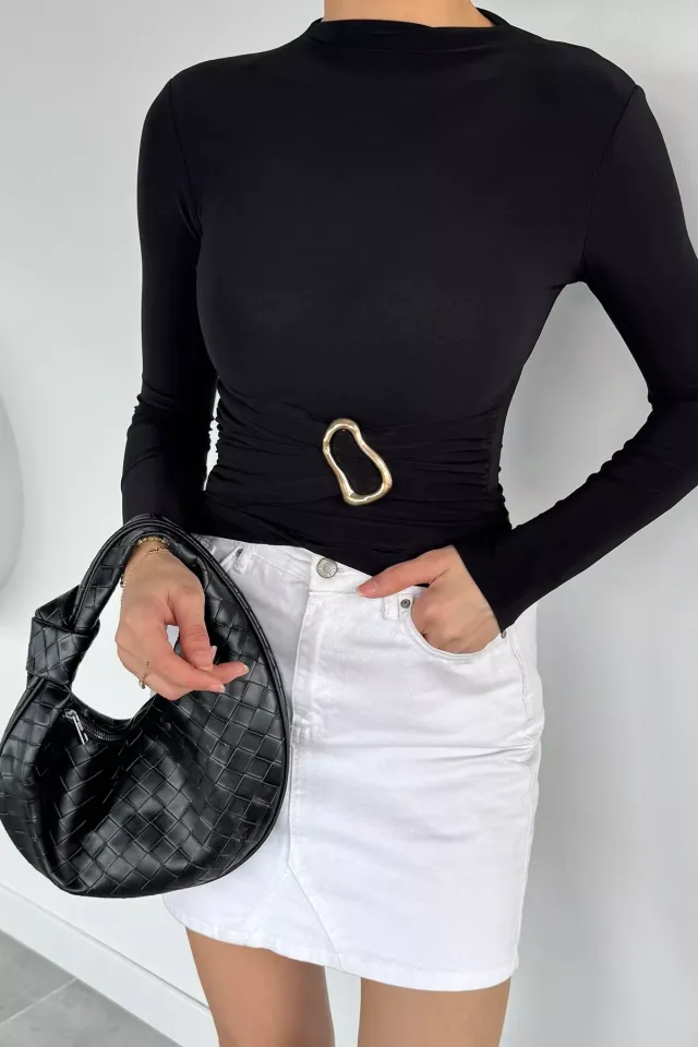 بلوزة بكتف مكشوف مزينة بدانتيل وتفصيل برغي من الأمام مع أكمام طويلة. قطعة أنيقة للتنسيقات اليومية .