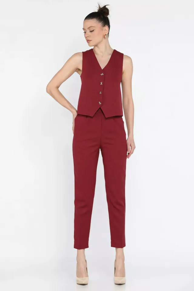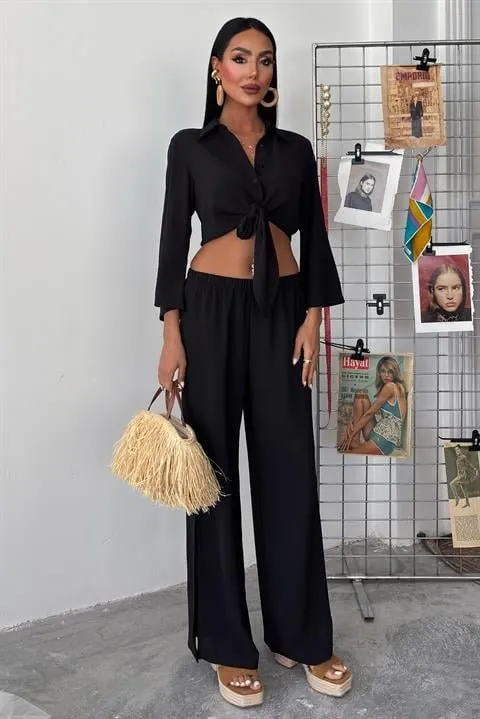 طقم صيفي مخطط للنساء، يتكون من بلوزة قصيرة بياقة هالتر وبنطلون. مصنوع من قماش كتان خفيف الوزن لراحة مثالية وإطلالة كاجوال أنيقة.