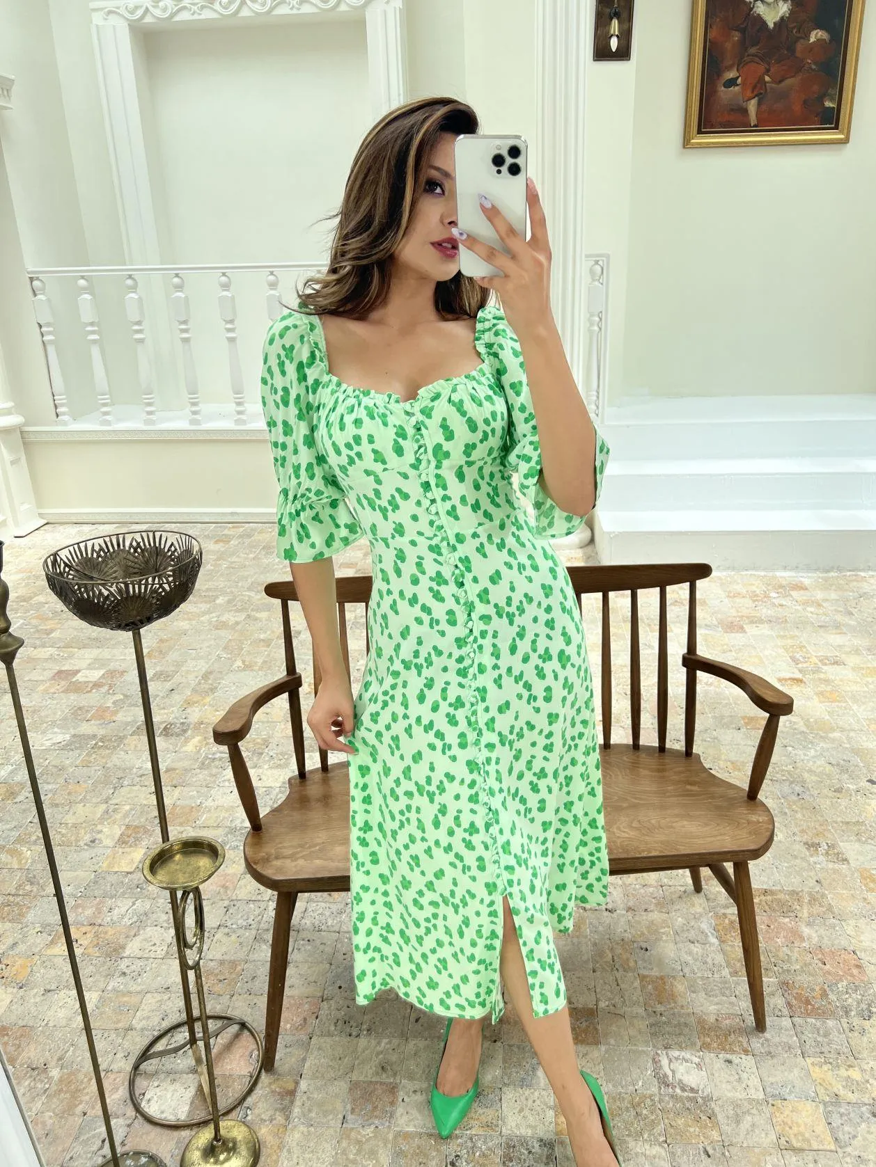 فستان ميدي مشجر بقصة كلوش بياقة دائرية وأكمام فراشة