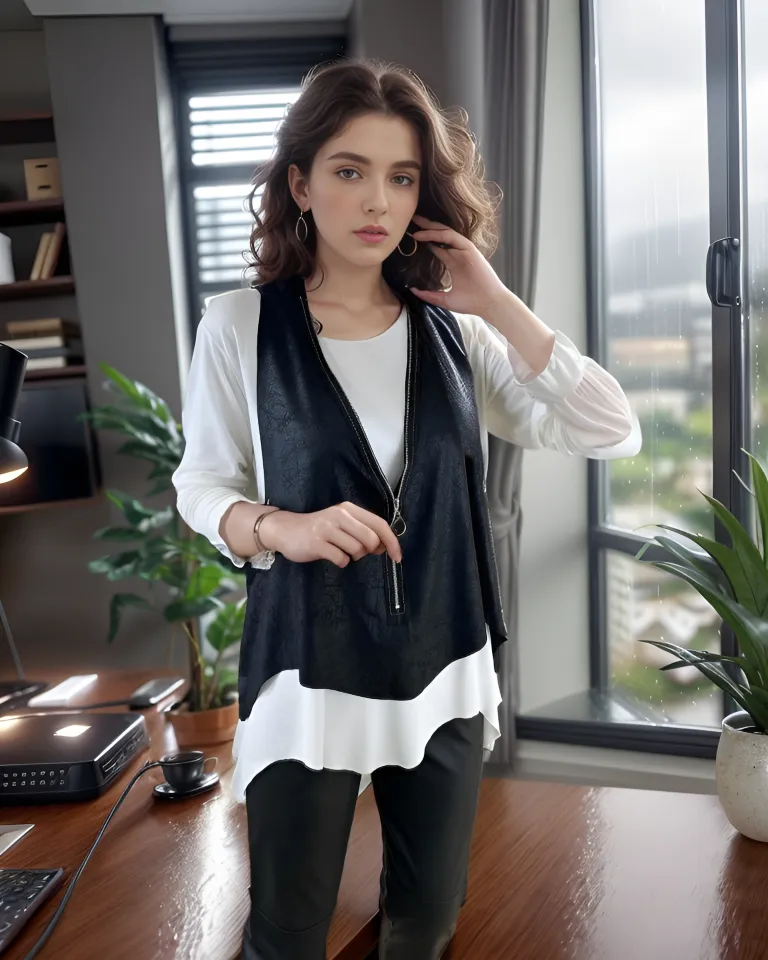 بلوزة محبوكة بياقة دائرية وأكمام قصيرة مع تفصيلة شرائط لونية. قطعة منعشة تضيف لمسة حيوية لتنسيقاتك اليومية.