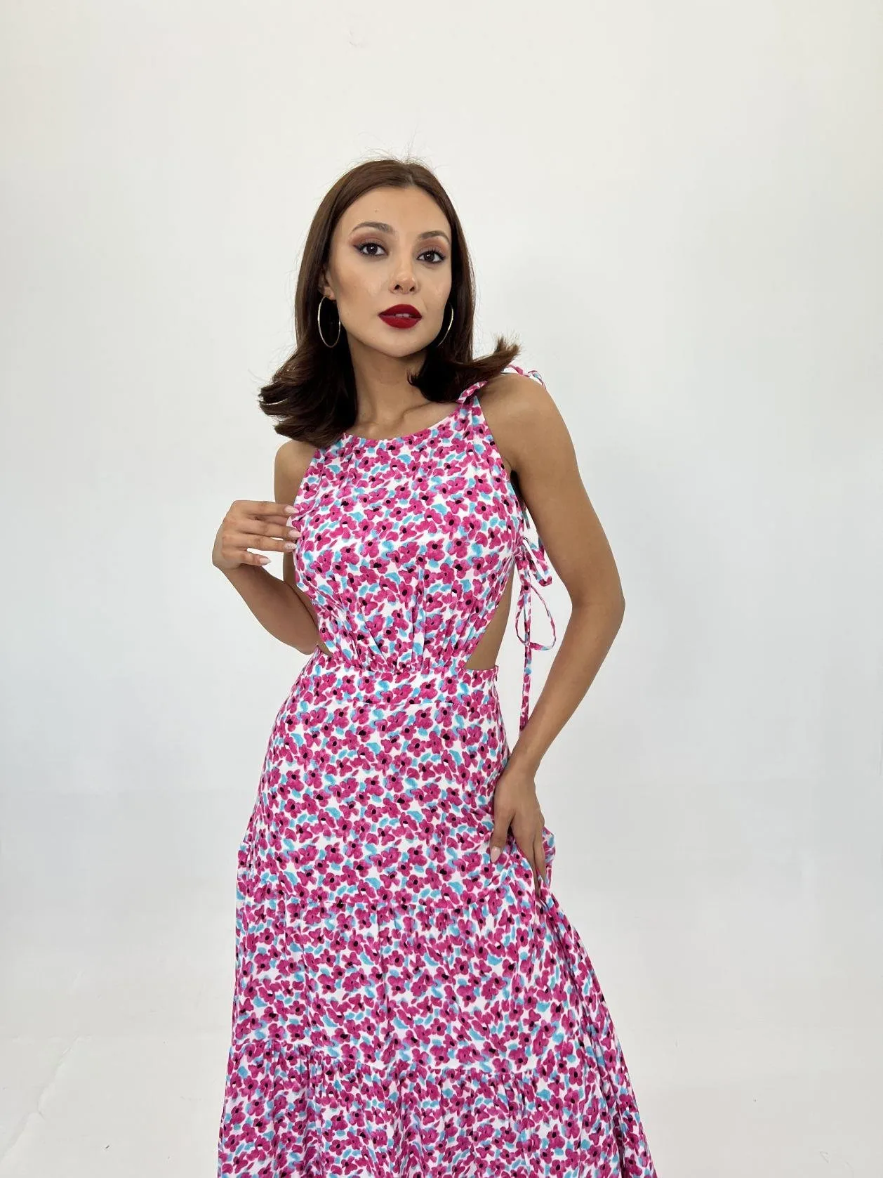فستان ماكسي بدون اكمام بسحاب امامي وياقة دائرية للنساء، بقصة كلوش سادة مزينة بكسرات لاطلالة صيفية مريحة.