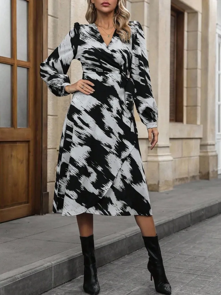 فستان ماكسي بنقشة وياقة مكشوفة مع كشكش وخصر مطاطي. تصميم انسيابي يمنحك أناقة ناعمة وحركة مريحة للنساء.