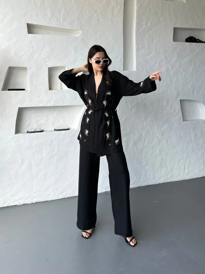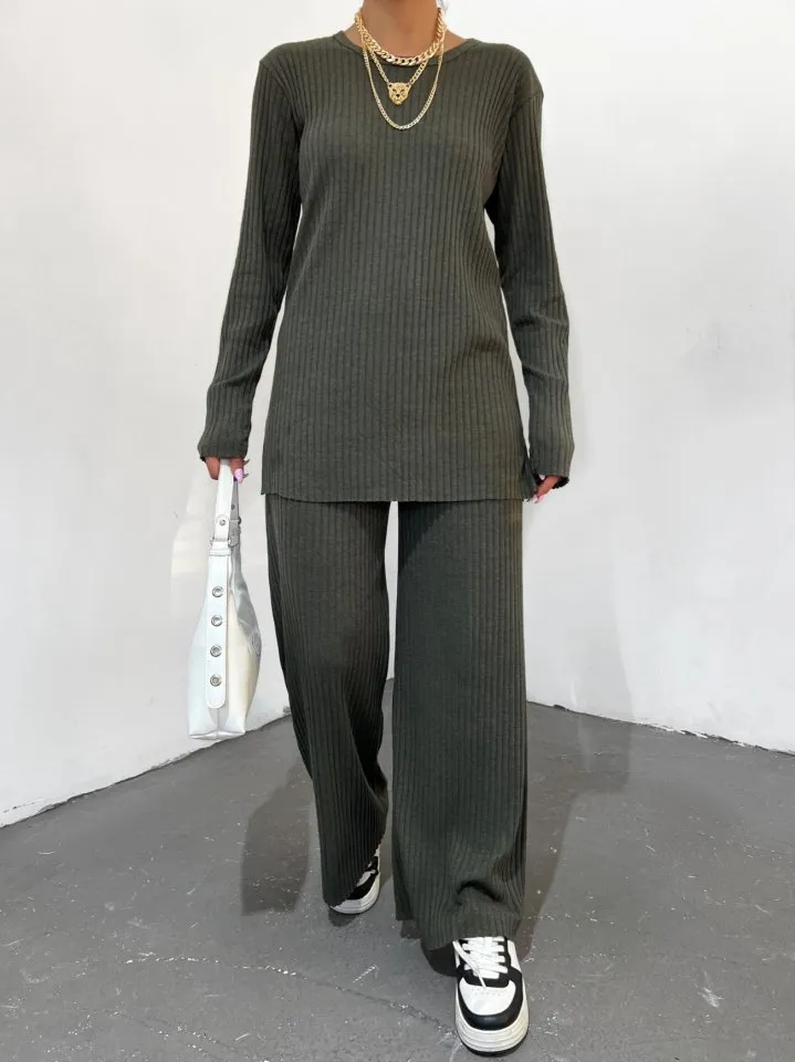 طقم نسائي مكون من بلوزة واسعة بدون أكمام مع بنطلون، يجمع بين الراحة والأناقة، مثالي لأيام الطقس الحار.