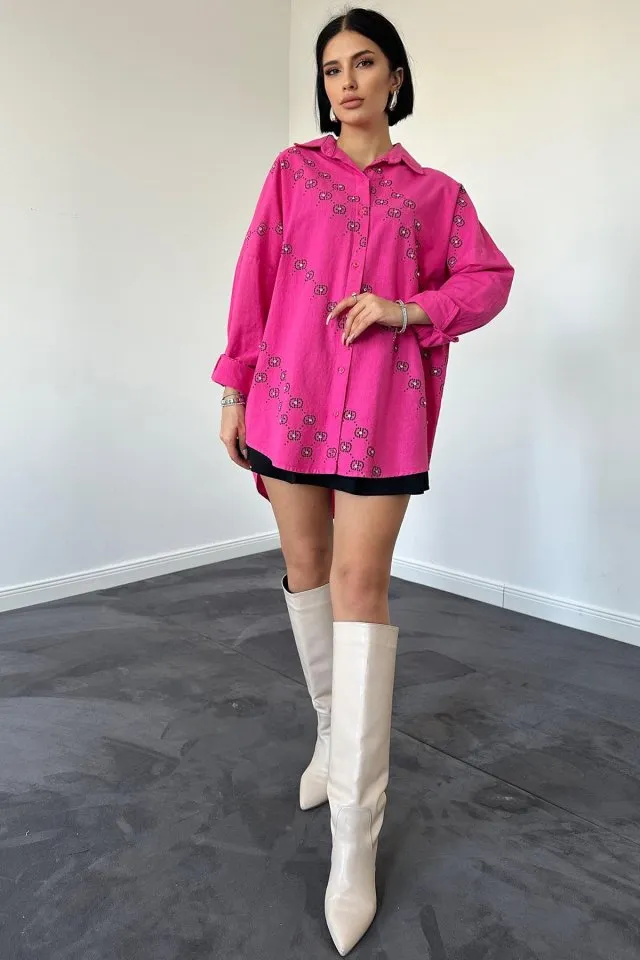 قميص نسائي كبير الحجم بأكمام طويلة ومنقوش، مثالي لإطلالة يومية مريحة وأنيقة. مصنوع من قماش ناعم وجيد التهوية. قابل للغسل في الغسالة على درجة حرارة 30 مئوية.