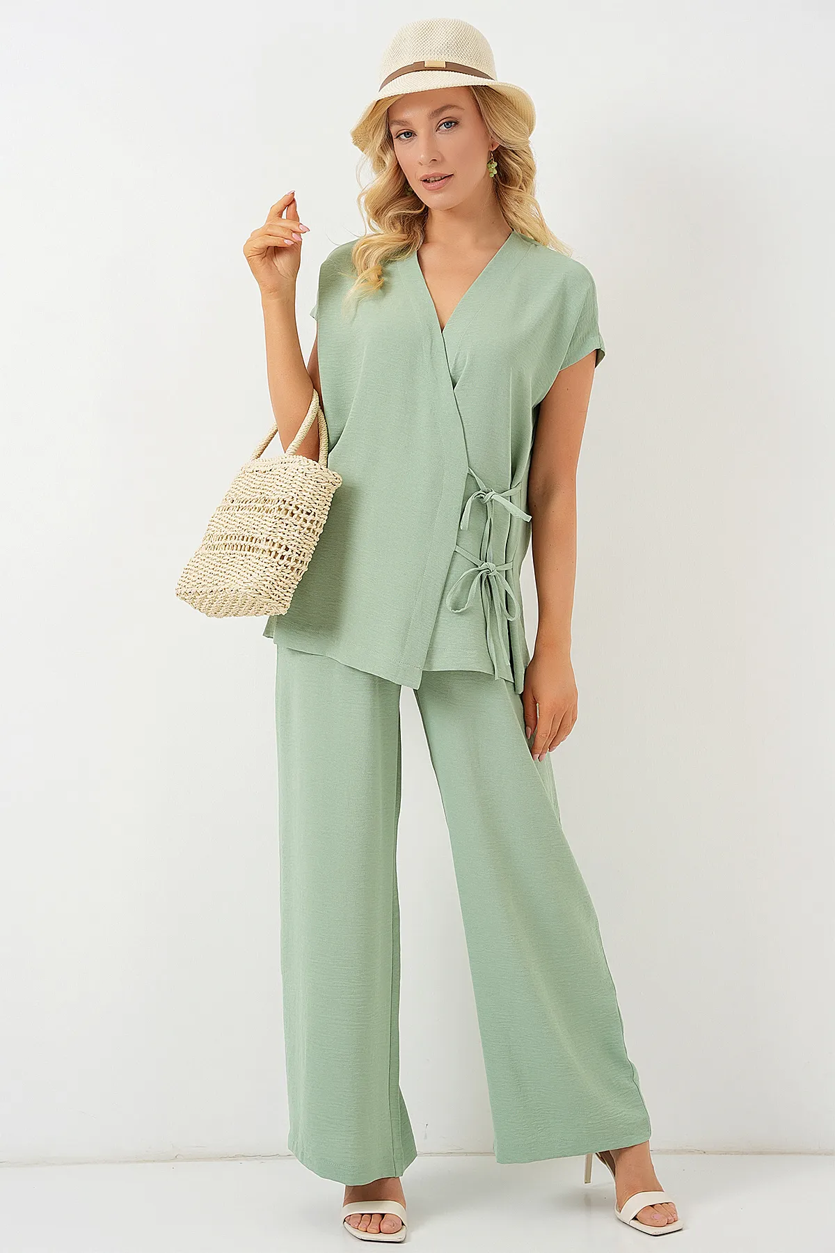 طقم صيفي نسائي مكون من بلوزة ناعمة الملمس بياقة دائرية وتفاصيل مخططة وأكمام قصيرة، مع بنطلون لإطلالة رائعة.