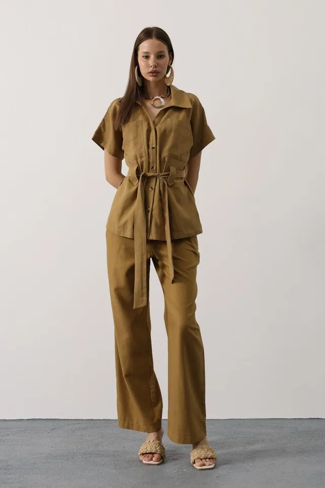 طقم صيفي نسائي مكون من بلوزة ناعمة الملمس بياقة دائرية وتفاصيل مخططة وأكمام قصيرة، مع بنطلون لإطلالة رائعة.