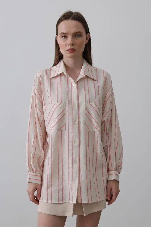 قميص نسائي من جلد السويد مع ياقة واقفة وجيوب مزدوجة، يضيف لمسة أنيقة وعصرية إلى مظهرك اليومي.