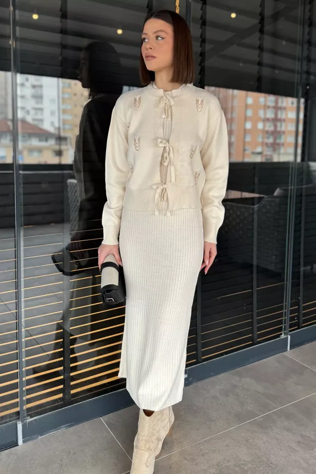 فستان ميدي تريكو مضلع بياقة قائمة بحمالات وظهر مكشوف، تصميم ضيق بخامة خفيفة وتفصيل مفتوح من الخلف
