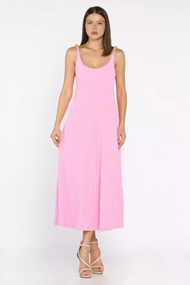 فستان ميدي تريكو مضلع بياقة قائمة بحمالات وظهر مكشوف، تصميم ضيق بخامة خفيفة وتفصيل مفتوح من الخلف