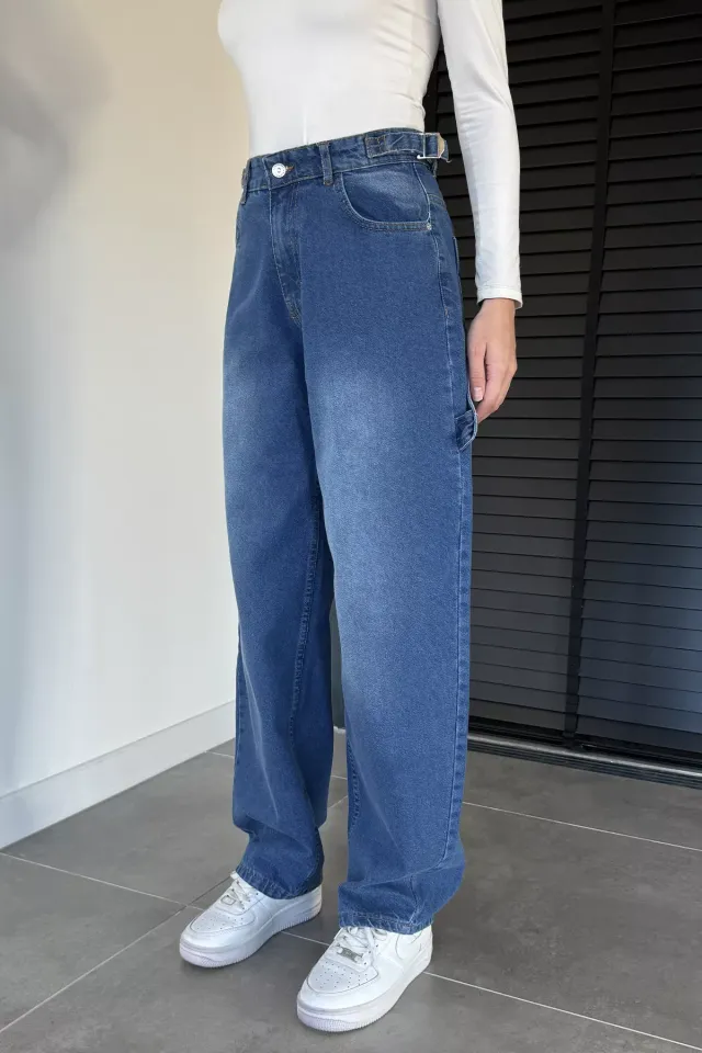 بنطال جينز نسائي واسع الساق بجيوب جانبية وتشطيب منسق. مثالي للإطلالات اليومية المريحة.