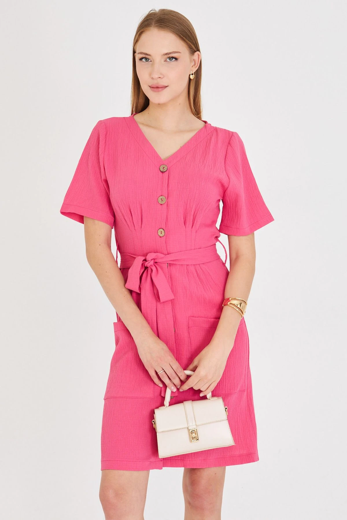 فستان ميني بكتفين مكشوفين وياقة V مع جوانب مزمومة وتفاصيل أزرار، تصميم ضيق يبرز إطلالة جريئة ومميزة للنساء خلال اليوم