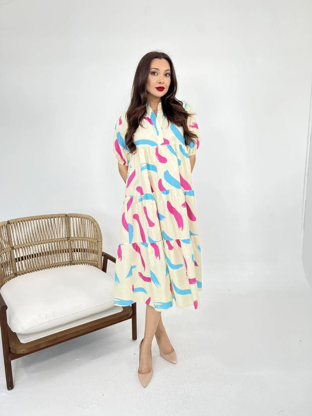 فستان نسائي صيفي مشجر بقصة كلوش وياقة V وفتحة عند الفخذ، مزين بحمّالات رفيعة وتنورة مطبوعة لإطلالة أنثوية منعشة.