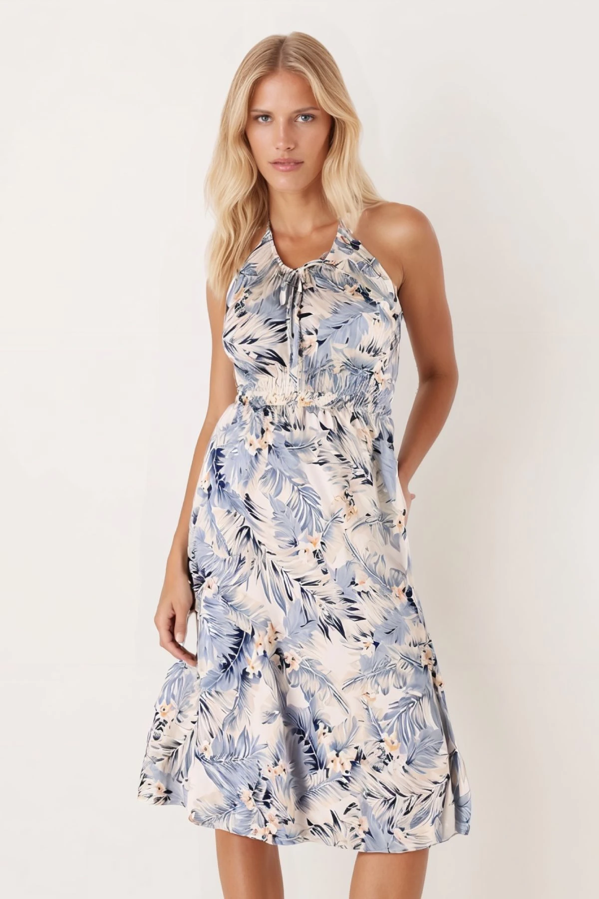 فستان ماكسي بياقة دائرية واكمام على شكل جرس مع حزام خصر، مزين بكسرات وقصة كلوش لاطلالة صيفية مريحة وراقية.