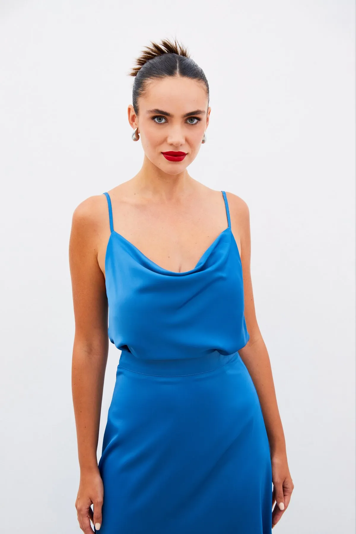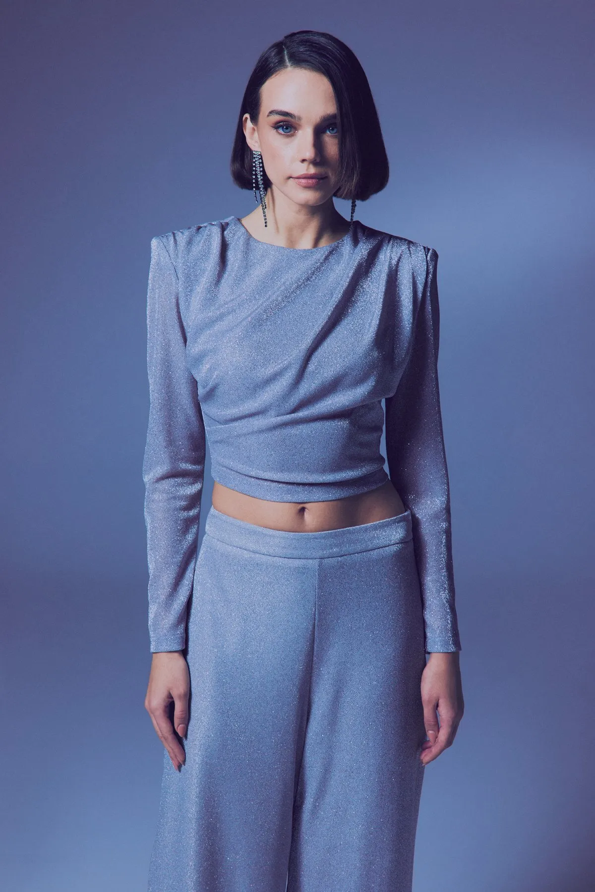 بلوزة ساتان بستايل لف وأكمام بكم مزموم. قصة أنيقة بانسيابية ناعمة تناسب النهار والمساء.