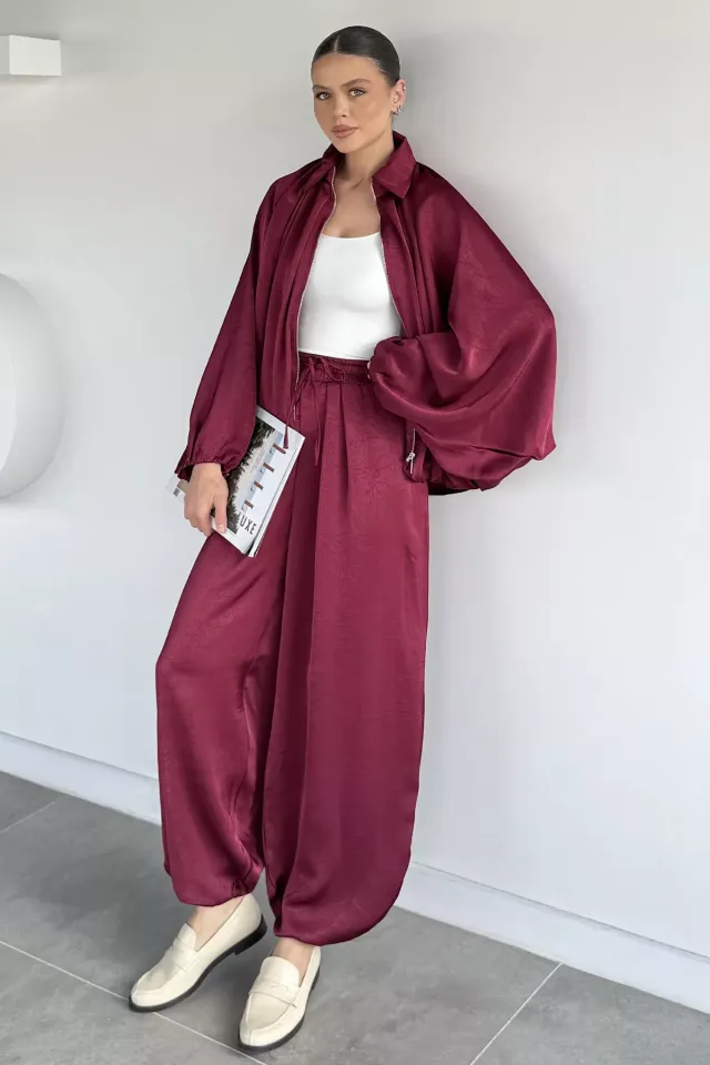 طقم مجعد من قطعتين، يتكون من بلوزة بكتف منسدل وبنطال واسع الساقين. خفيف الوزن ومريح لإطلالة يومية.