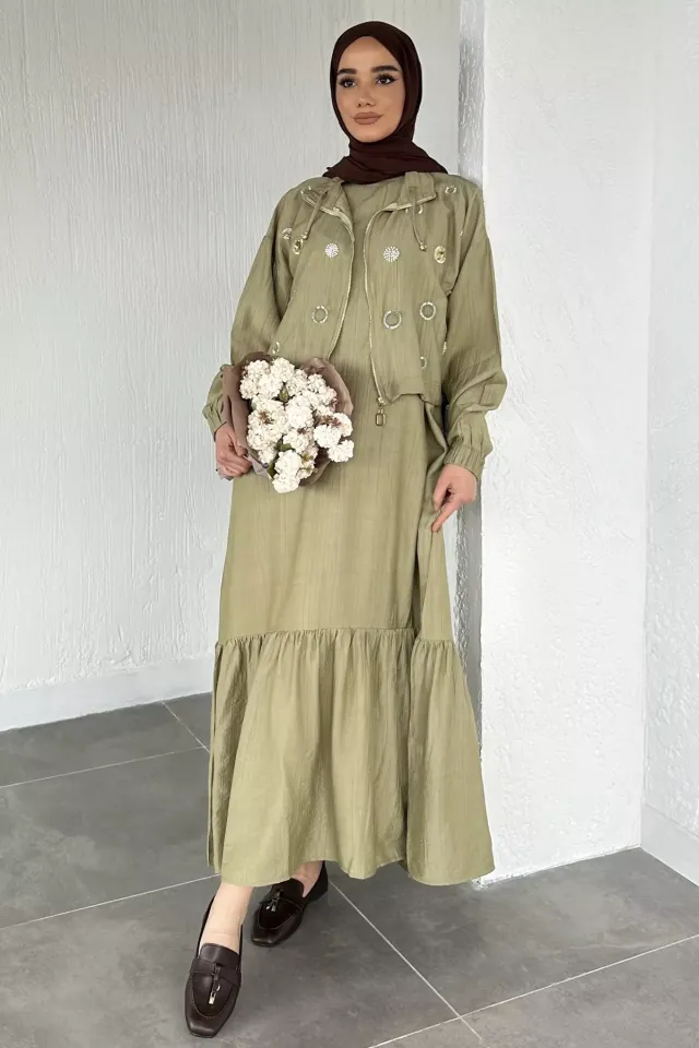 طقم نسائي مكوّن من تونيك وبنطال واسع، تصميم محتشم يوفر راحة وحركة أنيقة، مناسب للارتداء اليومي، اللقاءات الكاجوال، أو المناسبات شبه الرسمية التي تجمع بين الحشمة والأناقة.