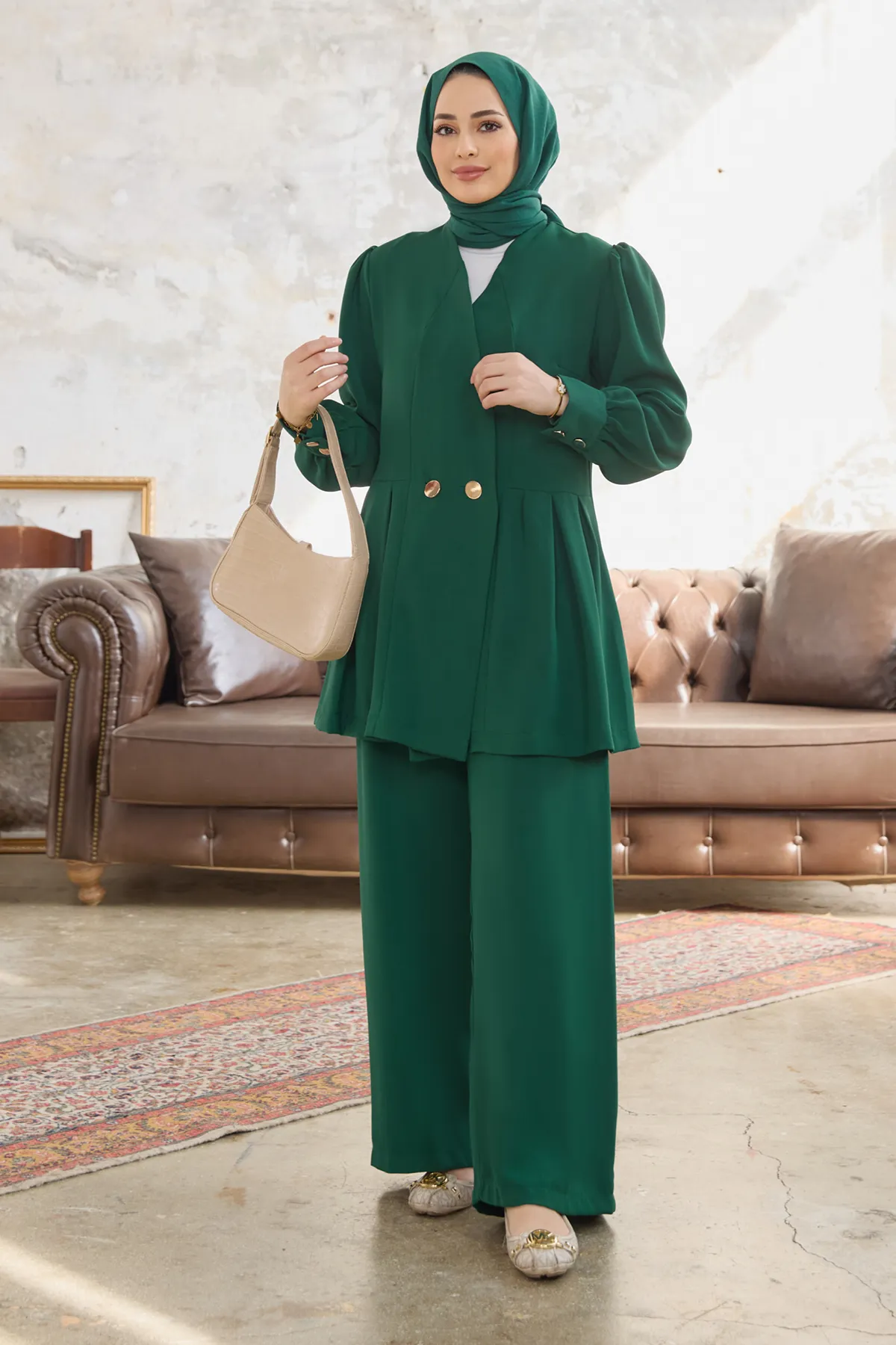 طقم نسائي مكوّن من تونيك وبنطال واسع، تصميم محتشم يوفر راحة وحركة أنيقة، مناسب للارتداء اليومي، اللقاءات الكاجوال، أو المناسبات شبه الرسمية التي تجمع بين الحشمة والأناقة.