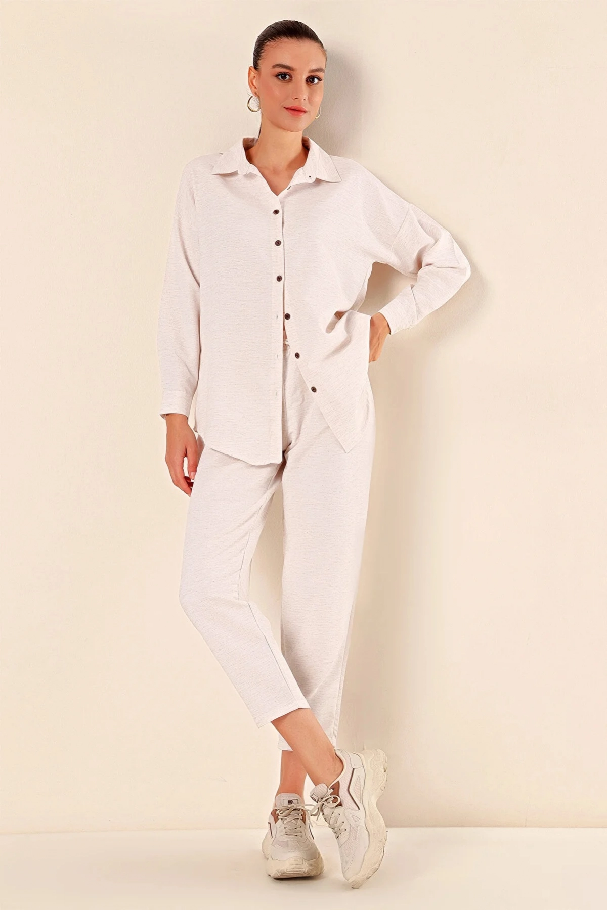 طقم جينز أنيق مكون من قطعتين بأكمام طويلة وتوب برقبة قميص، تصميم محتشم يجمع بين الراحة والأناقة البسيطة، مثالي لتجمعات العيد والطلعات الكاجوال.