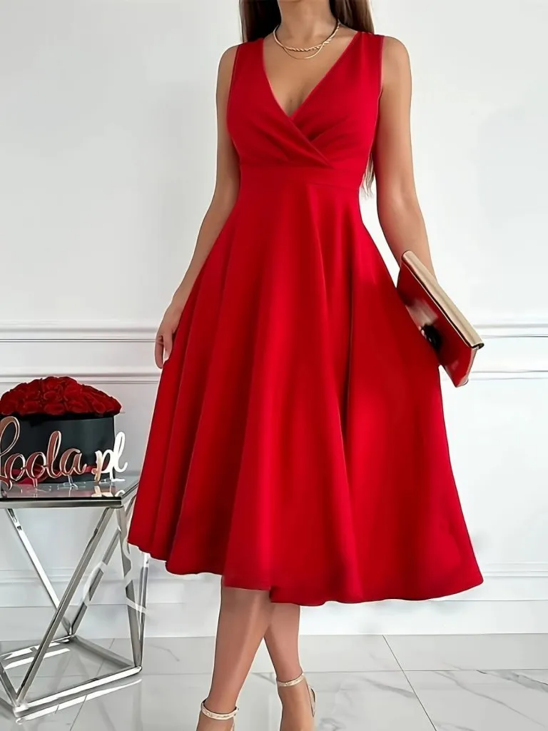 فستان ميدي منسدل مخطط بياقة V مزود ببطانة داخلية وأكمام واسعة مزمومة من الأسفل، قصة واسعة مريحة بطبقات خفيفة مثالية لإطلالات الصيف العملية للنساء