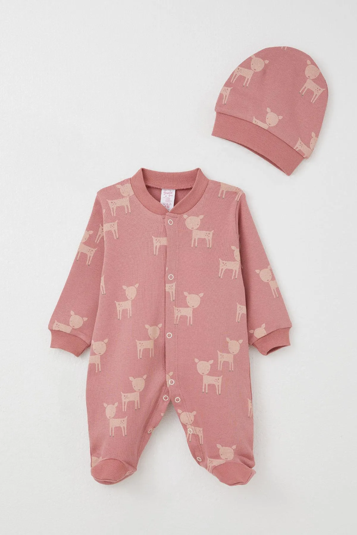 طقم مكون من 5 قطع بقصة منتظمة للبنات الرضع بنقشة حيوانات، مصنوع من قماش قطني محاكٍ 100٪، بياقة على شكل V وأكمام طويلة. يحتوي على أزرار ضغط، قفازات، قبعة، خصر مطاطي وبنطلون بقدم. خفيف الوزن ومناسب لجميع الفصول. يُغسل بالغسالة على درجة 40 مئوية.