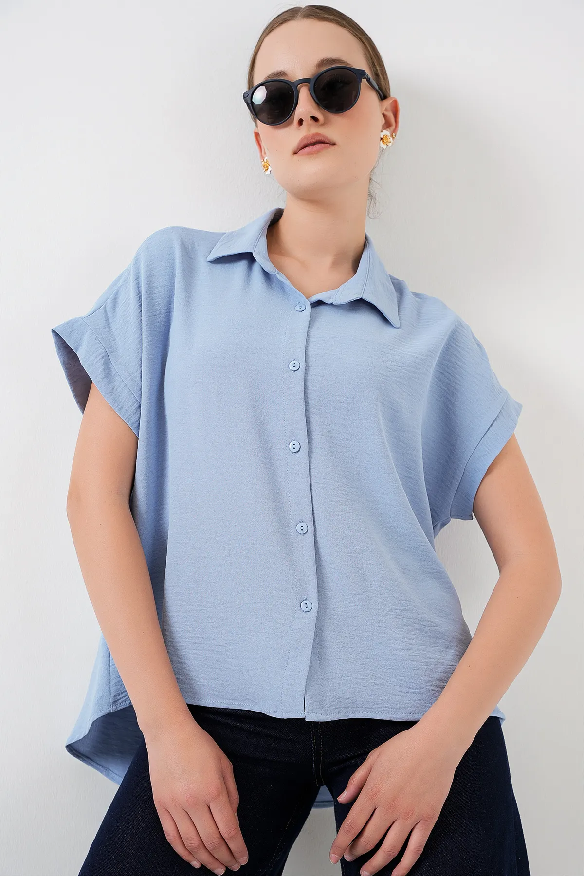 قميص نسائي سادة بأكمام طويلة وياقة كلاسيكية. مريح وأنيق، مثالي للارتداء اليومي.