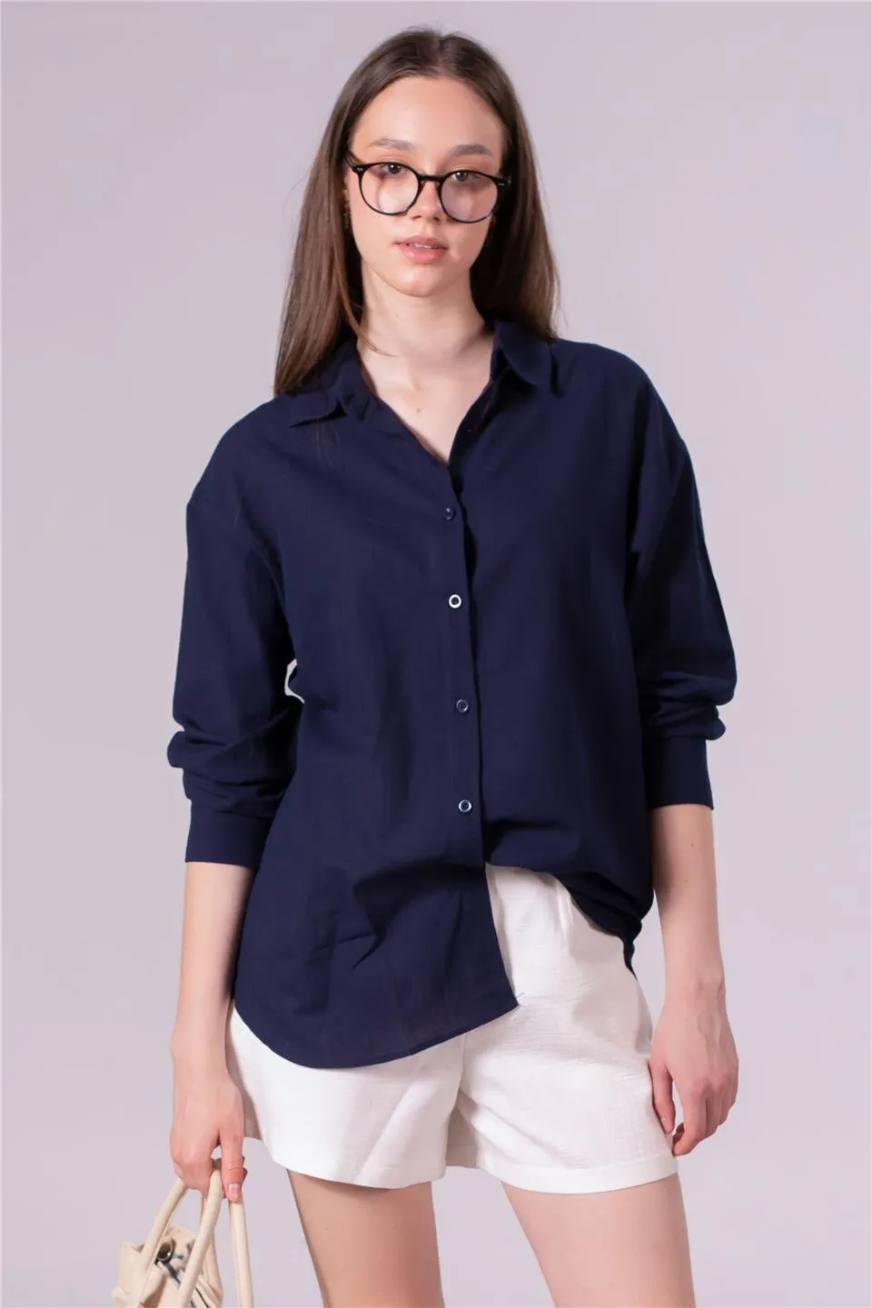 قميص نسائي بأكمام قصيرة وجيبين أماميين بلون موحد، مصنوع من قماش خفيف الوزن لإطلالة مريحة وأنيقة في الأيام الحارة.