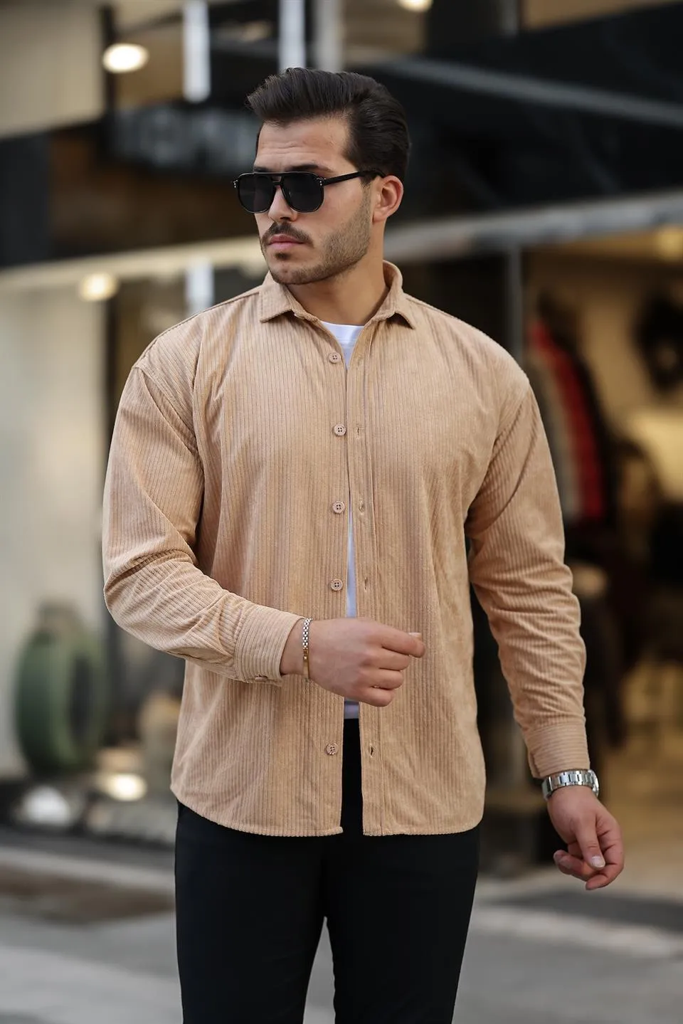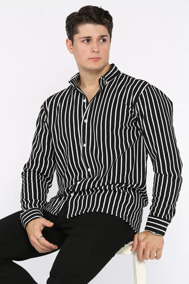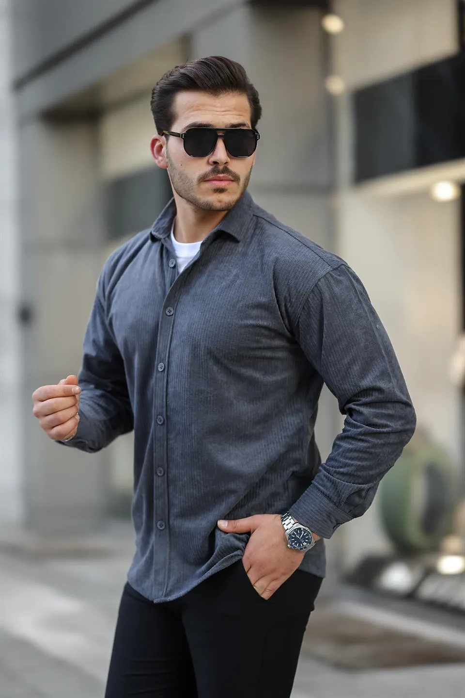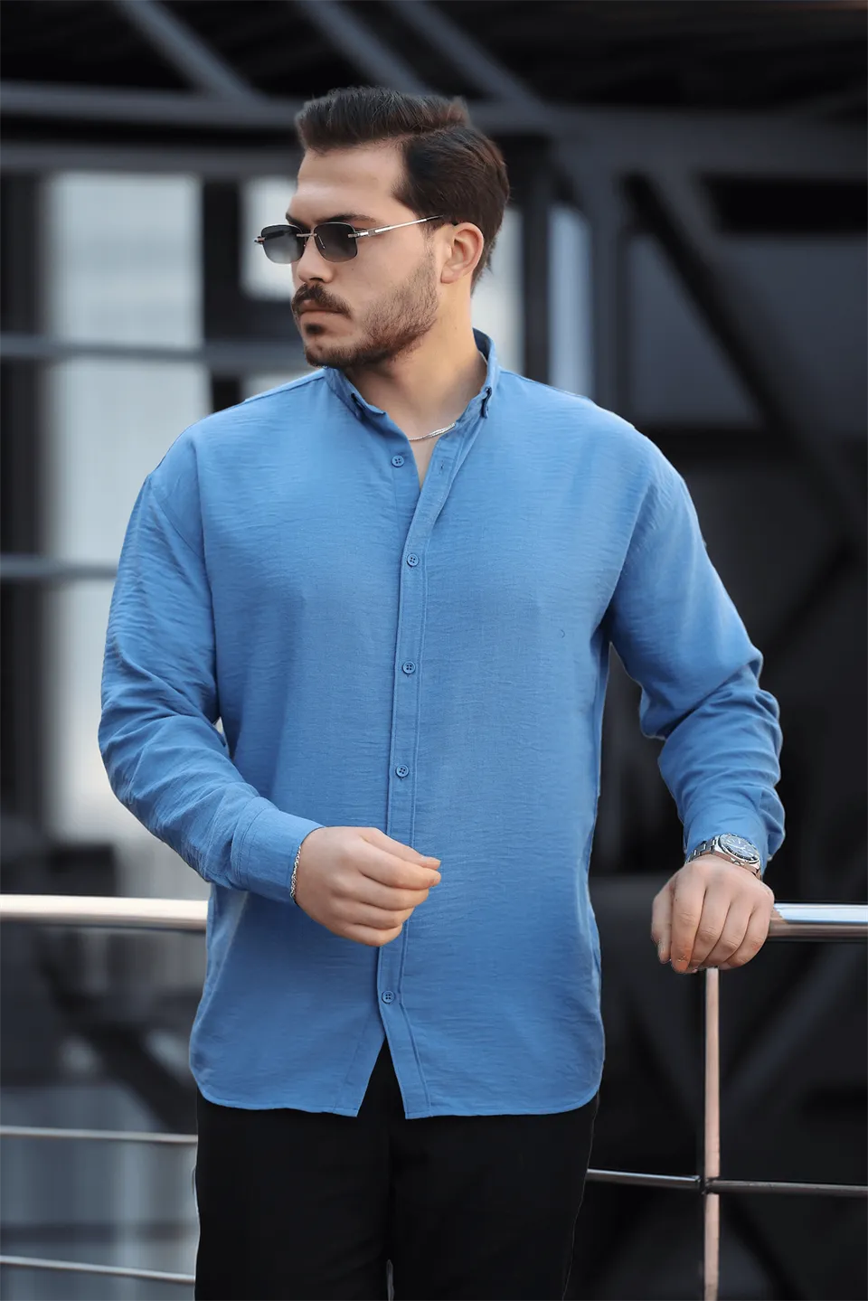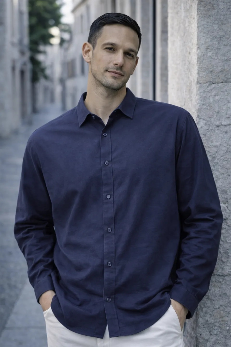 قميص رجالي سادة بأكمام طويلة وياقة كلاسيكية وأزرار، مصنوع من 95% قطن و5% ليكرا، ناعم ومسامي، ومرن قليلاً. مثالي للارتداء الرسمي وغير الرسمي. قابل للغسل في الغسالة على درجة حرارة 30 درجة مئوية.
