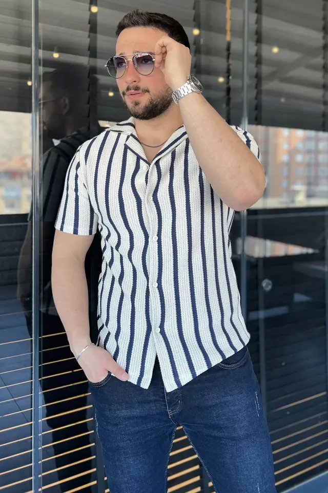 قميص سادة بأكمام قصيرة وياقة على شكل حرف V وأزرار للرجال - Beyond Store