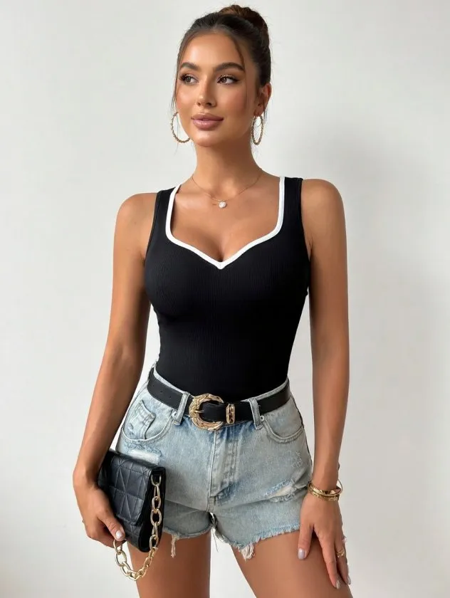 بلوزة محبوكة بياقة دائرية وأكمام قصيرة. خيار بسيط يناسب أيام الصيف والتنسيقات الخفيفة للنساء.