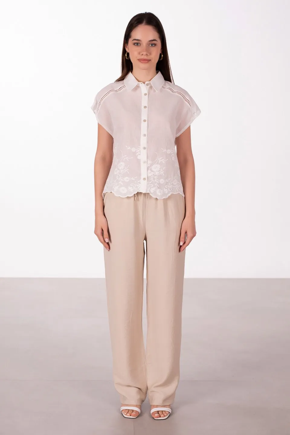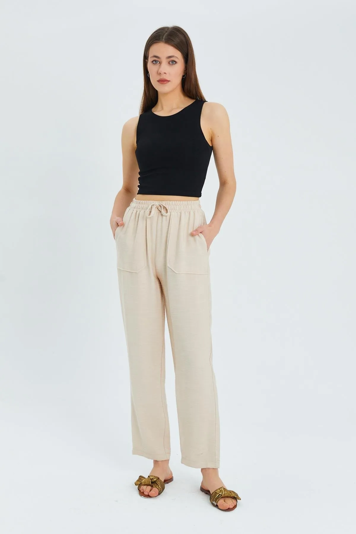 بنطال واسع بخصر مطاطي وقصة مريحة منسدلة. مثالي للتنسيقات اليومية السهلة.