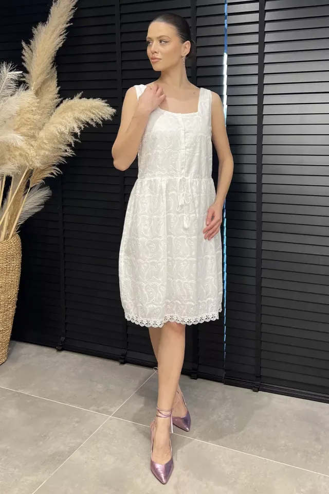 فستان ميدي كتان بربطات جانبية وياقة دائرية، مثالي للحركة المريحة والتنسيق اليومي العملي.