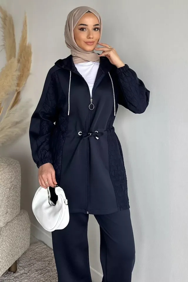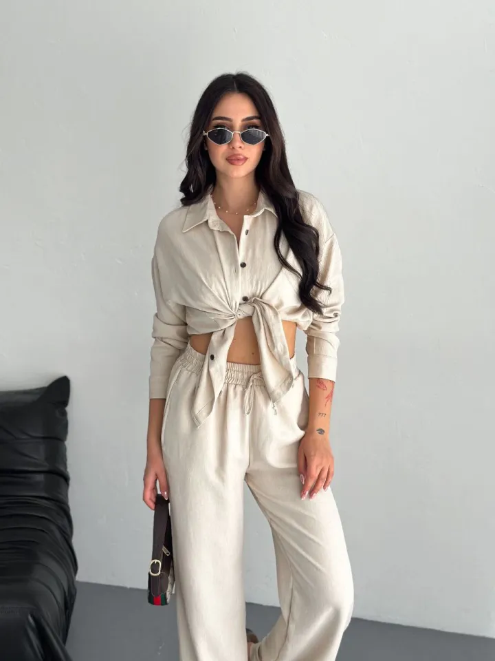طقم نسائي كاجوال من قطعتين ببلوزة بأكمام طويلة وياقة دائرية مع دانتيل أنيق.