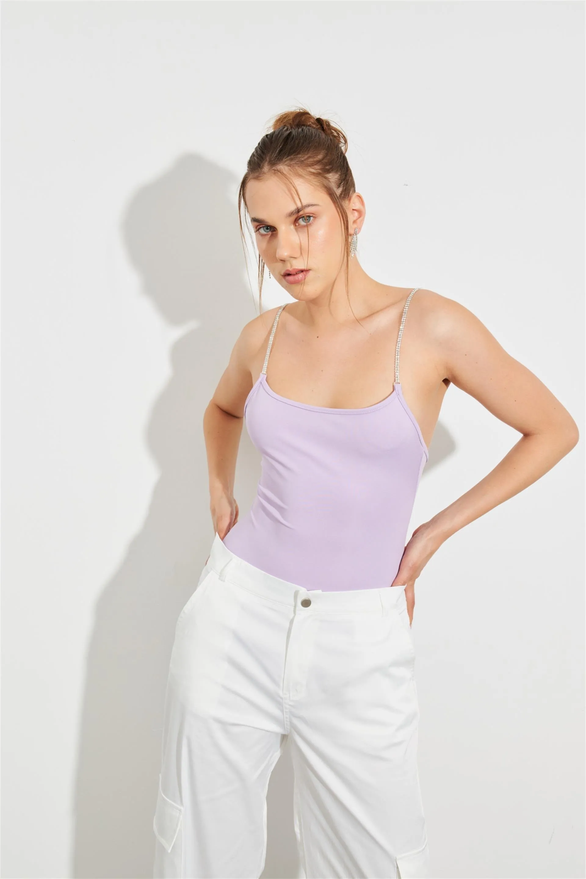 بستييه مزود بتبطين مع حمالات متقاطعة وقصّة V وتفاصيل دانتيل. تصميم ضيق كامي مثالي للاطلالات الصيفية اليومية.