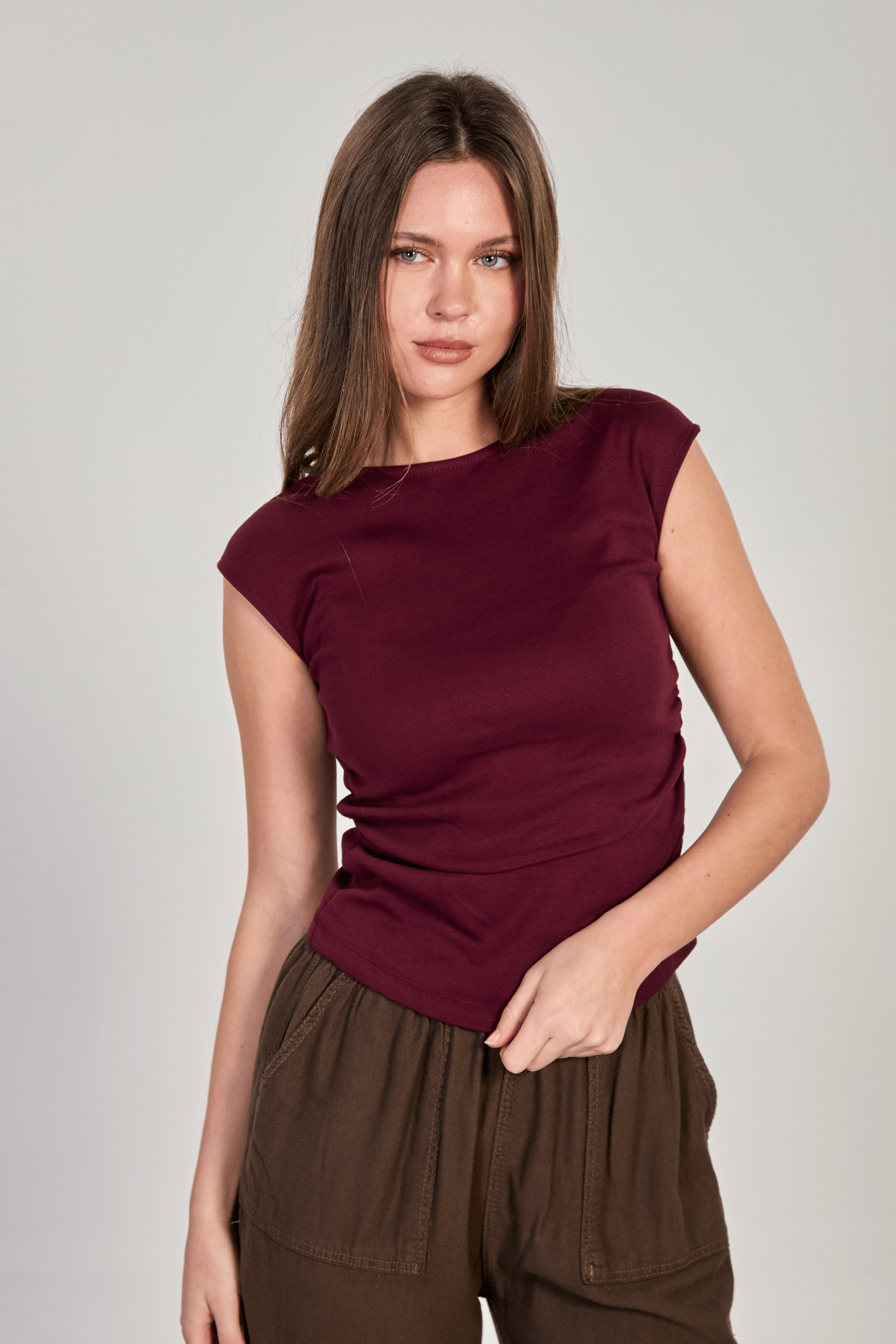 بودي قصير بأزرار أمامية وياقة V مع أكمام قصيرة. تصميم ضيق مثالي للاطلالات الصيفية اليومية.