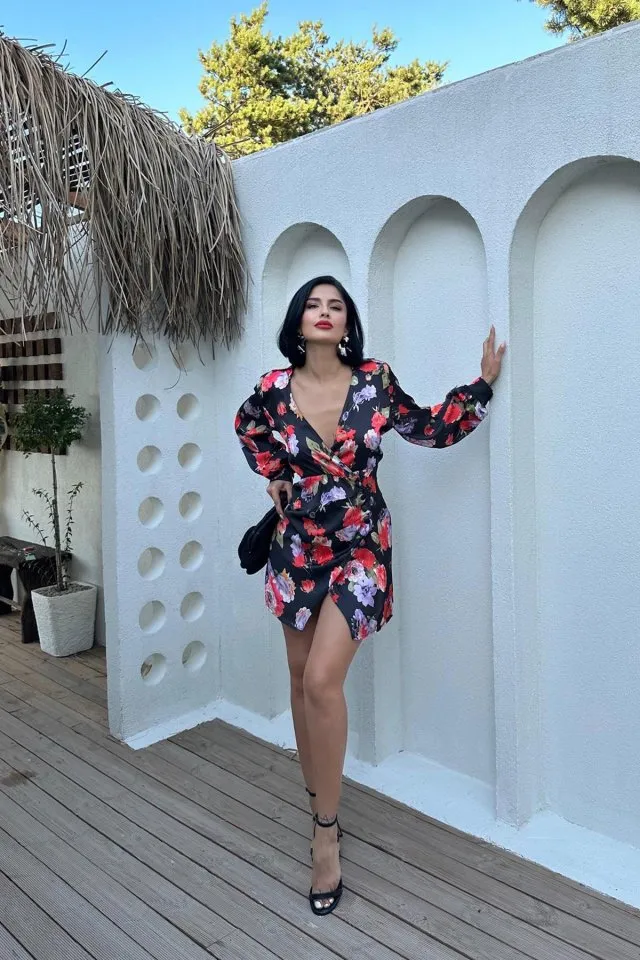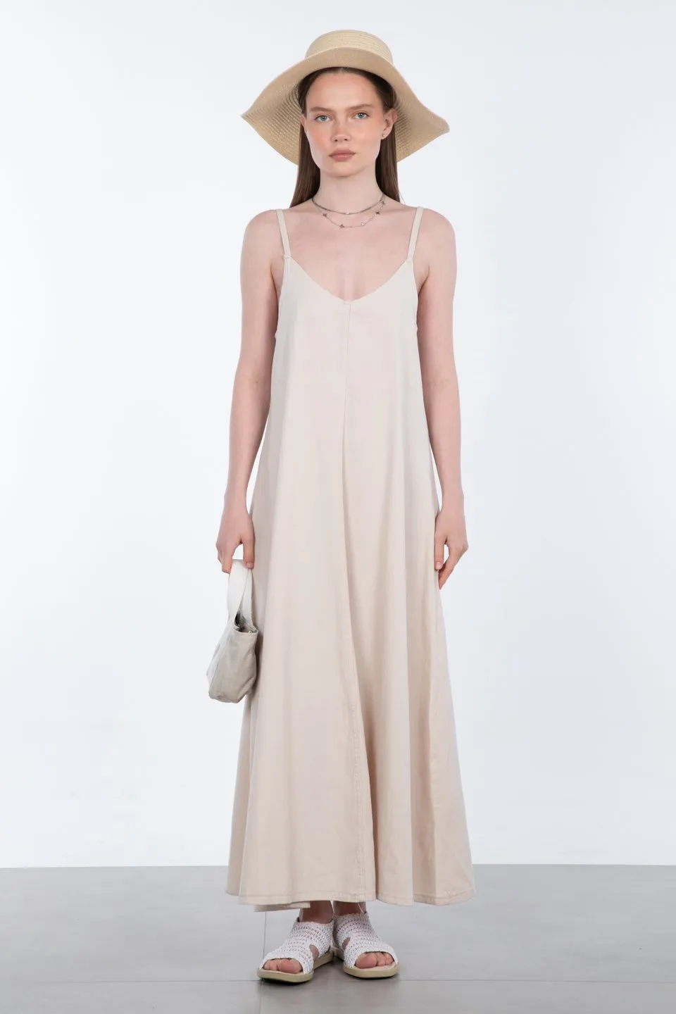 فستان بقصة A بياقة U وحمالات عريضة مع كشكش مزهر. تصميم بكسرات ناعمة يناسب الحركة الصيفية الخفيفة.