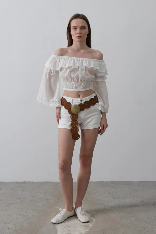 بلوزة بكتف واحد مع طيات أمامية وتفصيلة حلقة معدنية. قصة محددة تضيف لمسة عصرية وواضحة لتنسيقاتك اليومية.