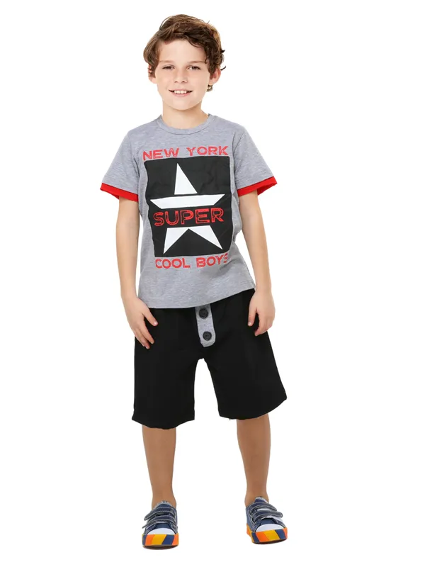 طقم صيفي مريح وأنيق للأولاد، يتميز بتيشيرت بياقة دائرية مزين بطبعة جذابة، مع شورت عملي مصمم لسهولة الحركة واللعب. مصنوع من قماش ناعم يسمح بمرور الهواء لراحة تدوم طوال اليوم، مثالي للطقس الحارة والارتداء اليومي. قابل للغسل في الغسالة على درجة حرارة 30 مئوية.