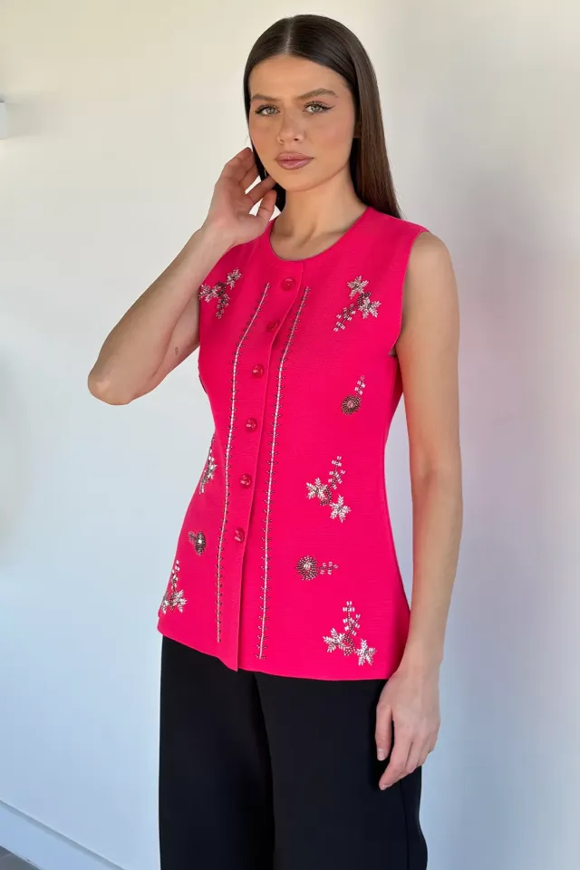 فيست نسائي تريكو بياقة بيتر بان ونقشة موج وتفصيل كشكش مع أزرار قلب