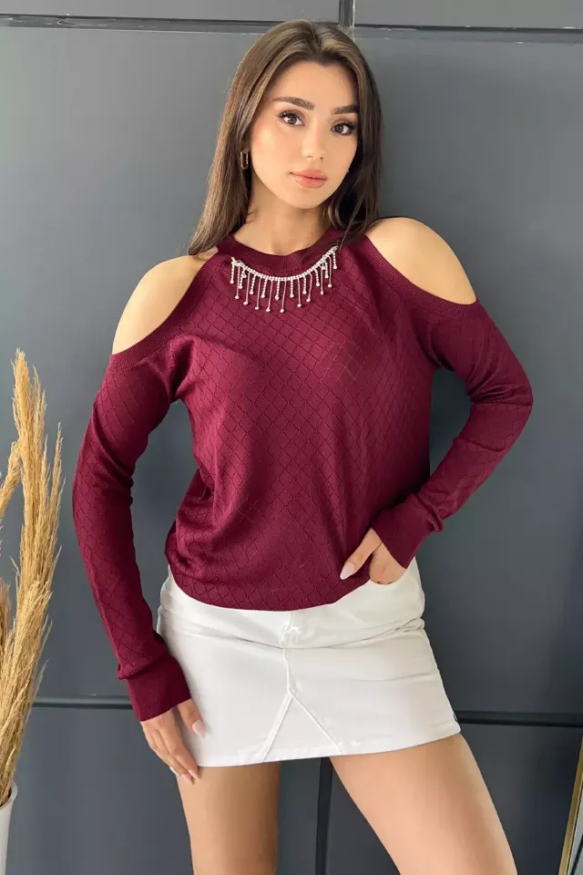 بلوزة محبوكة بياقة دائرية وتطريز حجر الراين للنساء - Beyond Store