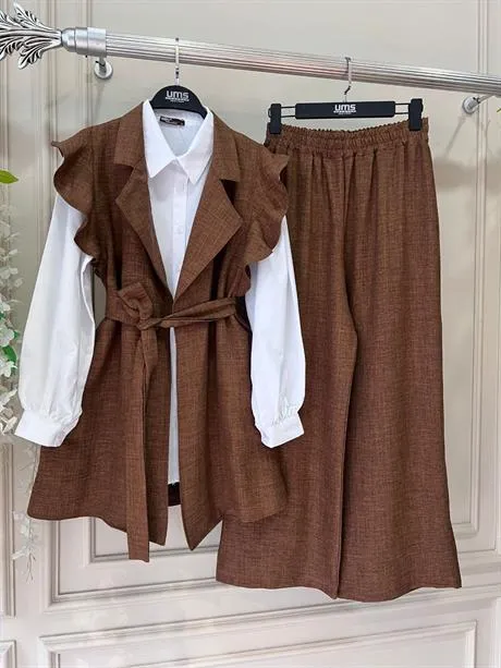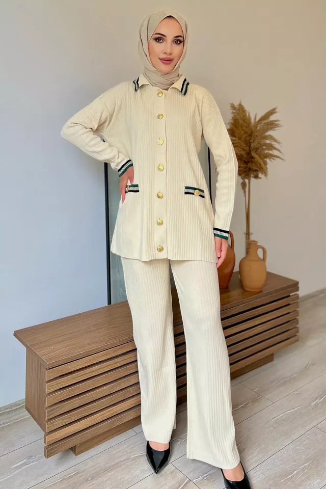 طقم تونيك وبنطال بنقشة مموهة مع ياقة قميص وكتف منخفض وخصر مطاطي، قطعة محتشمة لافتة لإطلالة صيفية واثقة.