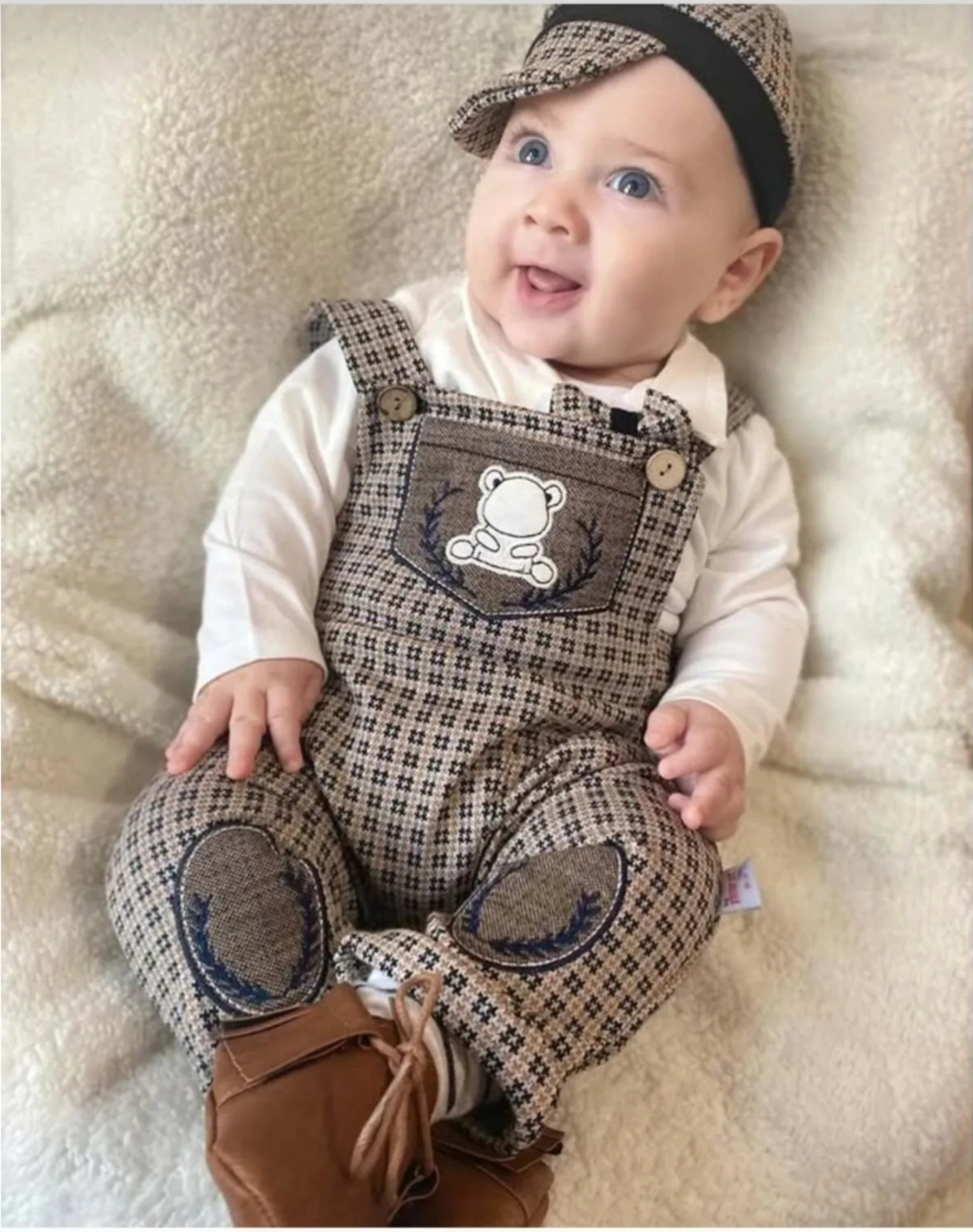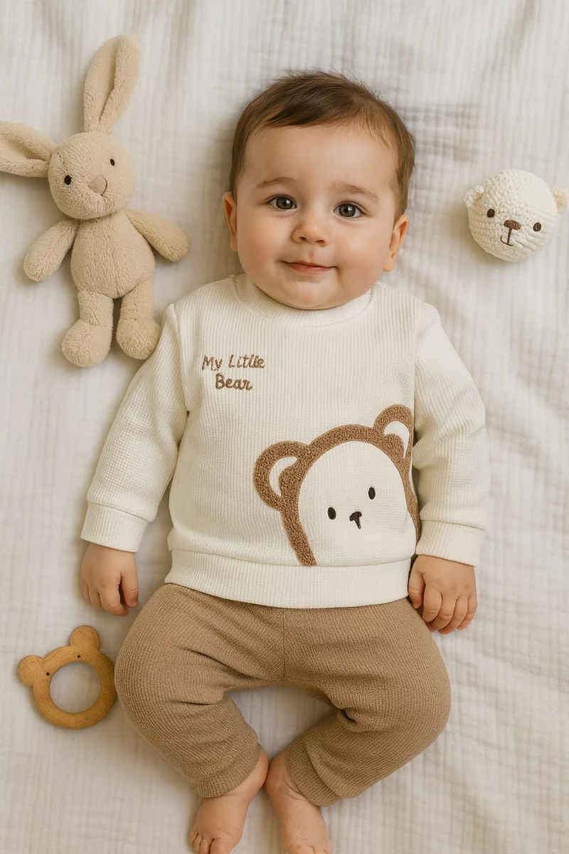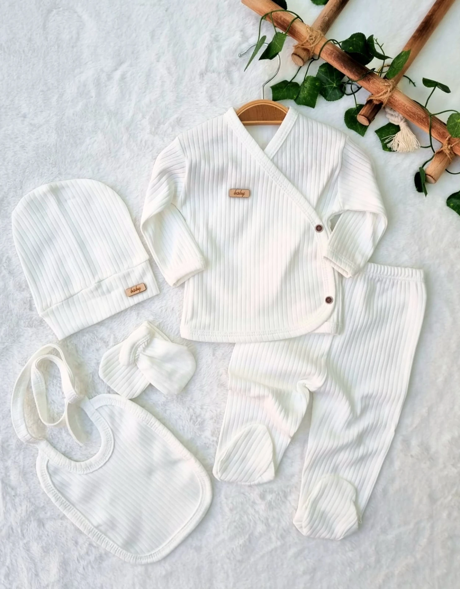 طقم ملابس أطفال حديثي الولادة من خمس قطع، مصنوع من القطن الناعم ١٠٠٪، مضلع، بأكمام طويلة، بتصميم مطبوع، مثالي للارتداء اليومي والموسمي. يُغسل على درجة حرارة ٤٠ درجة مئوية.
