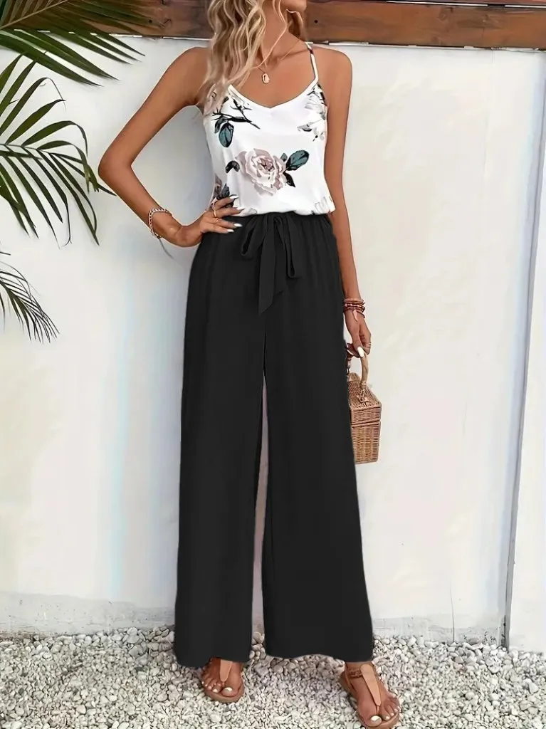طقم بلوزة للنساء بدون أكمام بياقة مطوية مع بنطلون واسع الساق بحزام