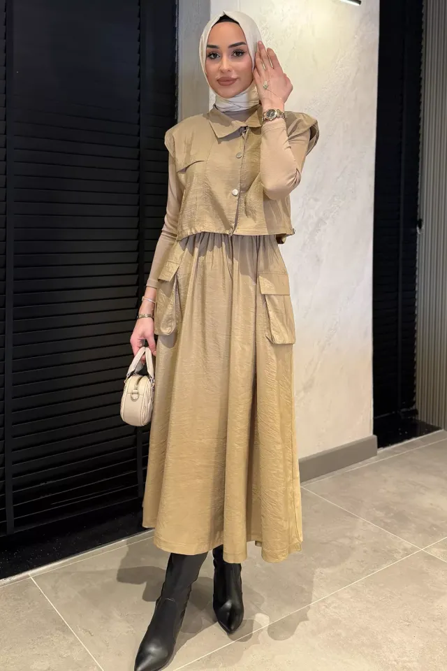 فستان ماكسي مزين بكسرات وسحاب أمامي مع ربطة خصر لإطلالة أنثوية محددة. مثالي لصباحات العيد والتنسيقات المحتشمة في الأجواء الصيفية.
