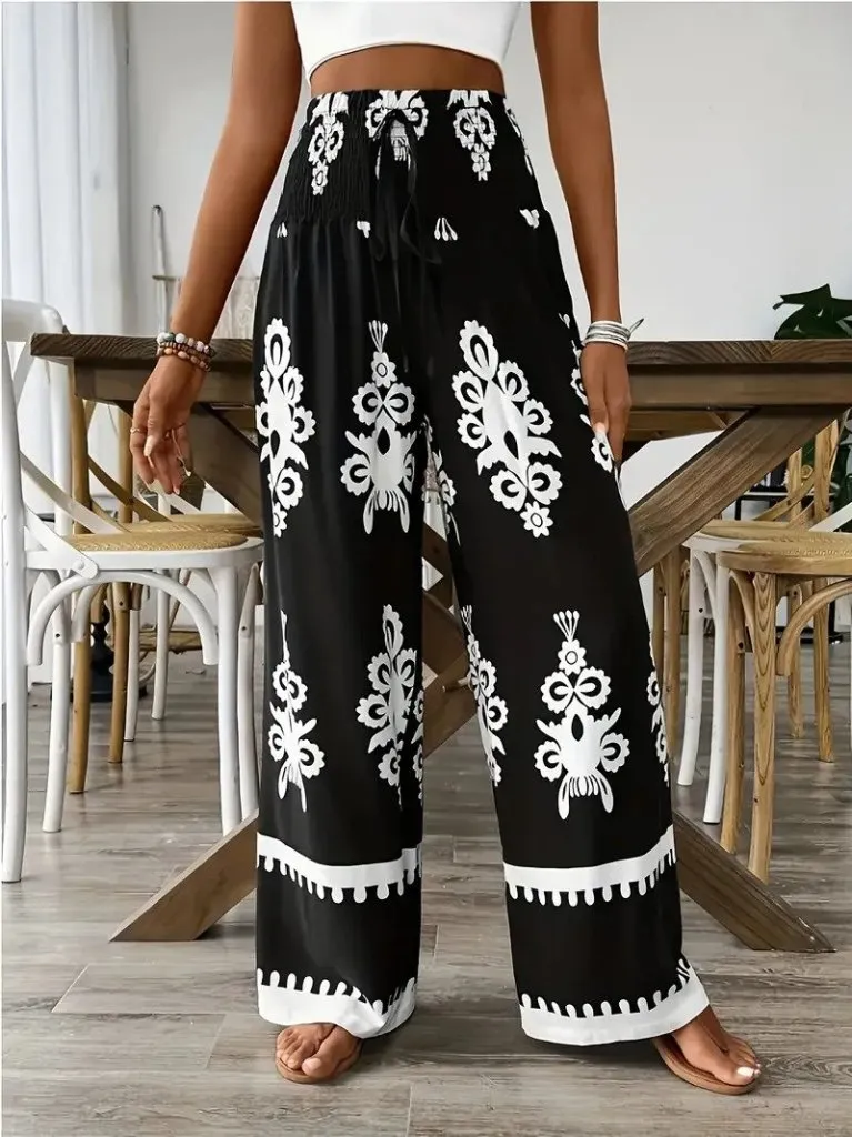 بنطلون كتان بقصة مريحة وخصر منخفض مع رباط، خفيف وأنيق بأسلوب كاجوال يناسب أيام الاسترخاء ونشاطات العطلات.