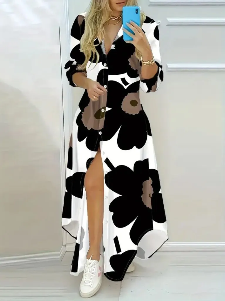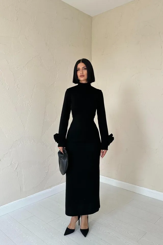 فستان نسائي ماكسي كلوش بياقة قائمة وأكمام طويلة مع تصميم كتف مكشوف وقماش مخرم