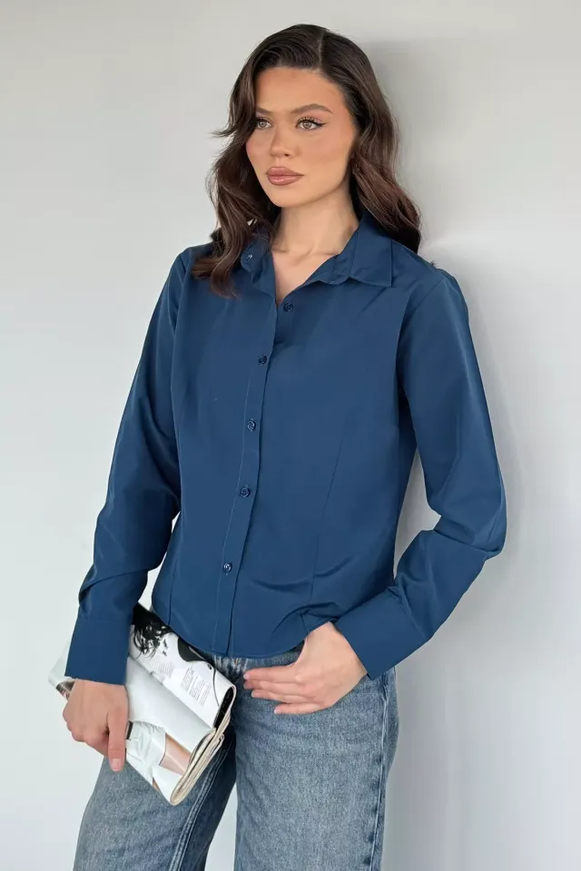 قميص نسائي مخطط كاجوال بأكمام طويلة مع جيوب أمامية مزدوجة، مصنوع من قماش مريح وخفيف الوزن مثالي لإطلالة يومية أنيقة وحديثة.